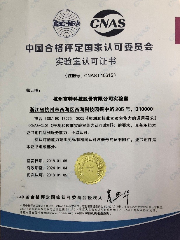 “杭州富特科技股份有限公司實驗室”以構(gòu)建顧客滿意為目標,以科學管理力為基礎(chǔ),以精心檢測為核心,通過優(yōu)質(zhì)高效的檢測技術(shù),實現(xiàn)一流的檢測實驗室。“杭州富特科技股份有限公司實驗室”為公司產(chǎn)品認證的重要基地,該實驗室獲得中國合格評定國家認可委員會認可的批復,符合實驗室能力認可準則的要求,具備承擔證書附件所列服務的能力。提升公司整體研發(fā)技術(shù)水平,提高公司產(chǎn)品的核心競爭力。